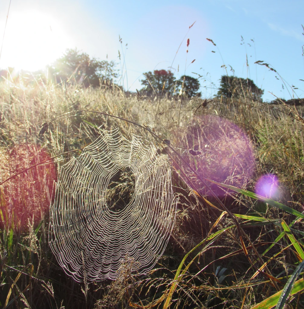 And yet here on The Lizard, there is much beauty and joy to be found. Large pods of dolphins have been regularly sighted around the coves and the lovely purple and pale pink Cornish heather has started to emerge all over the coastal hills. In the field here skylarks have gathered, alongside the cinnabar caterpillars climbing all over the ragwort. There have been mass gatherings of spiders and they have been busy making their webs; the orb webs, the funnel webs and sheet webs are all sharing the field. The seasonal dew in the mornings make all these homes a stunning glittering display, especially when the sun shines on them.
