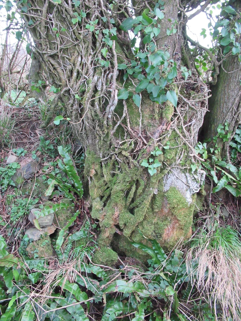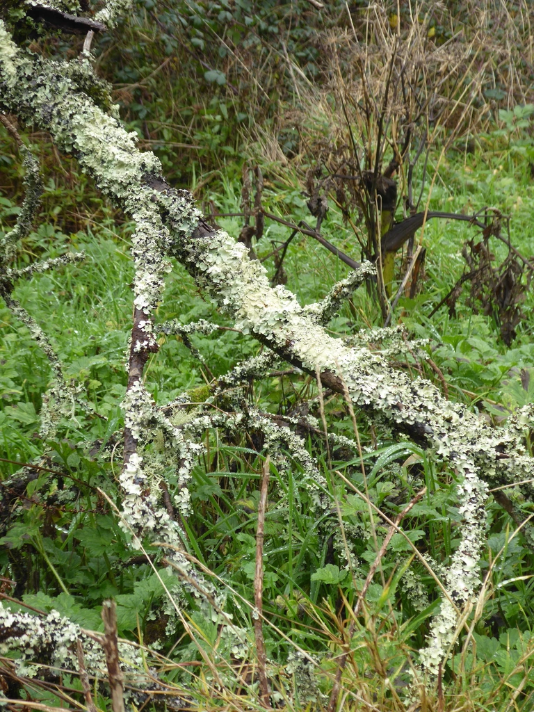 floods and fallen trees causing havoc. The Lizard had many cloudy, windy and wet days but plenty of sunny days as well. The autumn colours were still strong and plenty of plants were still growing and forming new foliage for next year, the grass was still lush and verdant. The ferns became more visible in the hedgerows and banks as other plants and bushes died away. Hart’s tongue was busy unfurling its leaves, side by side with the male and the lady fern. The lichens were out in all their glory, covering the bare leaf trees, rocks and stones. Naturally the obvious presence of the ferns and lichens got me thinking about the story they might tell me about our field and its health. I started my voyage of discovery with the lichens.