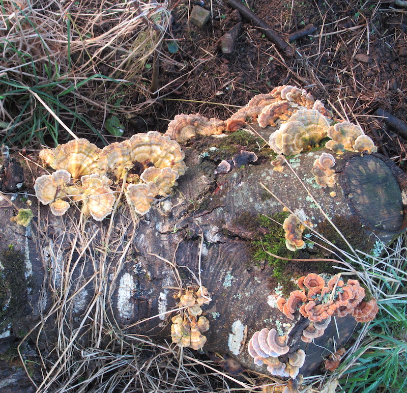 But the big story this month is the fungi. Not the edible kind, I’ve been looking at the species that grow on the dead wood. The mild and damp weather must have given them a new burst of life because they appear to be forming families in many different areas all over the place. Fungi is part of a group of organisms called decomposers, without which the entire ecosystem would struggle to function – so no pressure on the fungi then. The World Economic Forum describes fungi as ‘a family of superheroes, whose powers range from fighting cancer to cleaning up pollution’ and ‘a form of tree fungus has been hailed as a possible defence against bio chemical weapons’, thus putting our so called intelligence into perspective. Their basic job is to break down dead plants, trees and animals, allowing it to become part of the humus layer which helps create good soil to feed future generations of trees and plants. There are hefty tomes that have been written about fungi – I am aware that I am glossing over quite a bit here. I have managed to name a few of the fungi lying around on the dead wood, most of which come under the umbrella term of polypores. I have found many different versions of turkeytails, which look exactly like, guess what? Yes, turkey tails. Glorious colours from slate blues to pinks, corals and ochres. We also have Dryad’s saddle, which sounds very like a health issue and a few Blushing brackets. My next mission is to search out Hen of the Woods and Chicken of the Woods, both edible. The Hen version is prized for its rich mushroom taste and the Chicken variety, as its name suggests, can be used in many recipes to replace chicken. Just saying.