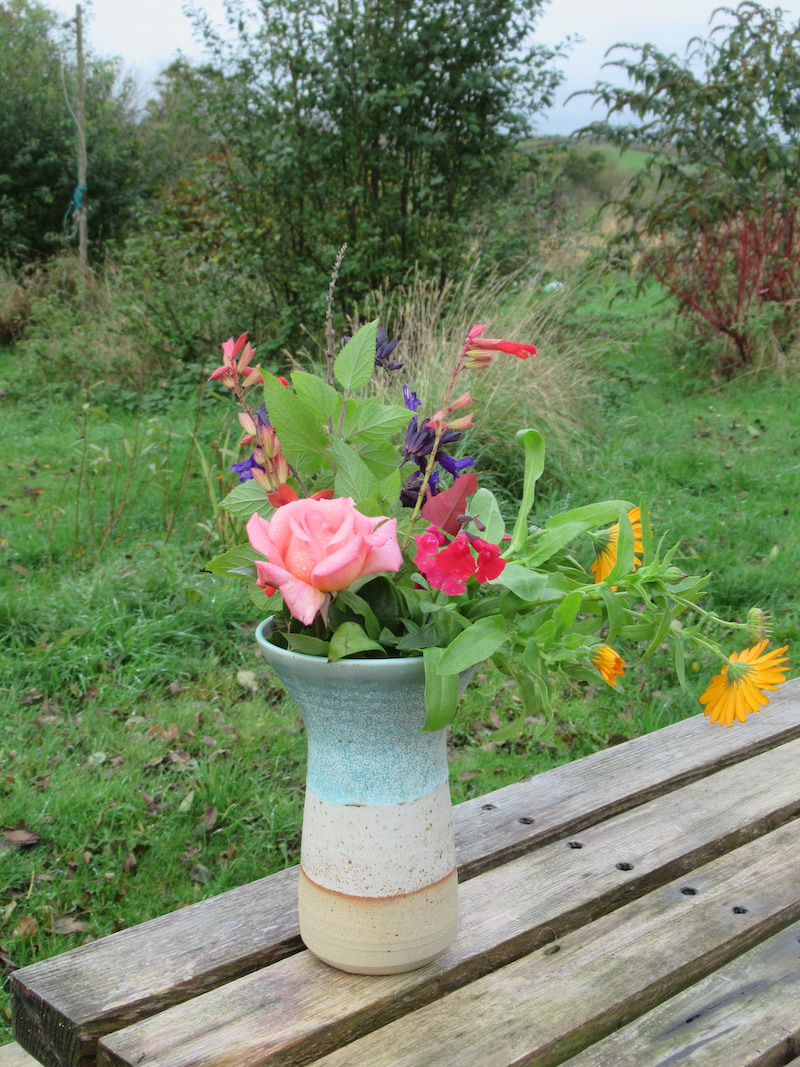The Juniper trees have grown well but no berries have ever appeared. The sweet chestnuts were also absent. Traveller’s Joy was in full view, still draping itself around the various hedgerow plants and bushes. The mushrooms were having a field day, apparently this month has seen a bumper crop everywhere, the warm and moist conditions being perfect for their growth. In the garden there were still the blooms of pink roses, scarlet salvias and orange calendulas. The blackberries were still ripening on the vine and showing signs of confusion in their growth pattern; new flowers were appearing with both closed buds and open petals on display.