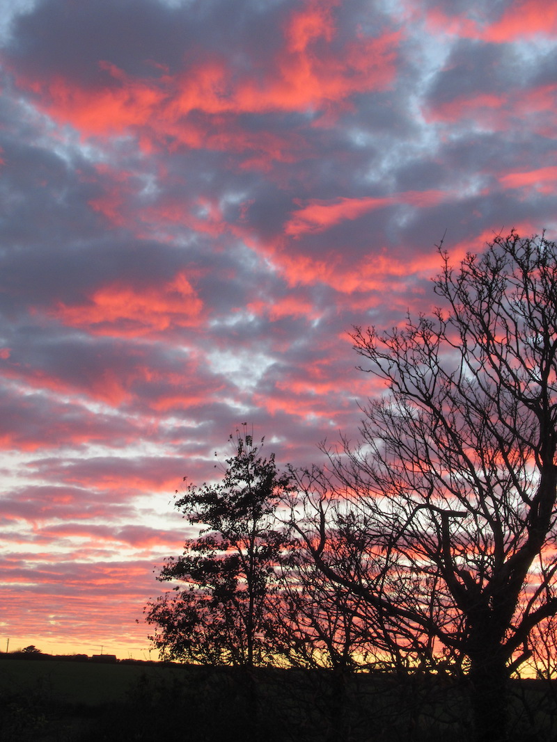 on The Lizard. The Autumn colours began to emerge but never completed the full fiery display. A few mornings of light frost down in the valley of the field but always by midday the sun was warming us and bathing the fields in bright light and long, long shadows. Red Admirals were still around and sunbathing on the leaves. Sunsets were numerous and particularly stunning, with burning reds, oranges and pinks colouring the evening skies.