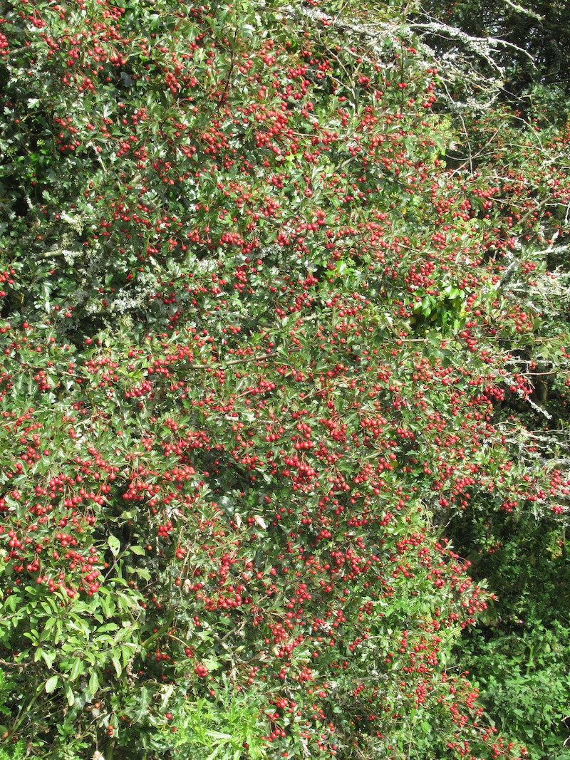 The hedges, field fauna and trees all continued to grow vigorously throughout the month. The wild Apple tree in the field hedge is heavy with cascades of fruit and has already started to drop its fruit. We are not collecting any from the hedge this year due to an abundance in our orchard trees. The smell of apple juice is already pungent as you pass by this spot in the hedge. Sloes and Haws sit side by side in full bloom, the reds and purples lining the hedges. These berries are loved by the birds, judging by the fabulous display this year, trees dense with the fruits, there’s going to be a lot of happy birds this Winter. Blackberries are still dripping from their bushes, both ripe black fruits and sour red berries yet to ripen. There are more young Oaks springing up and dozens of young Elm saplings and 3 Ash trees down by the river, one has now reached the height of at least 15 foot. As I wander up the hill, away from the river, green foliage is punctuated by a gentle mauve colour provided by the late flowering of some stubby Creeping Thistle plants. Splashes of yellow are delivered by the Gorse and Dandelion flowers.