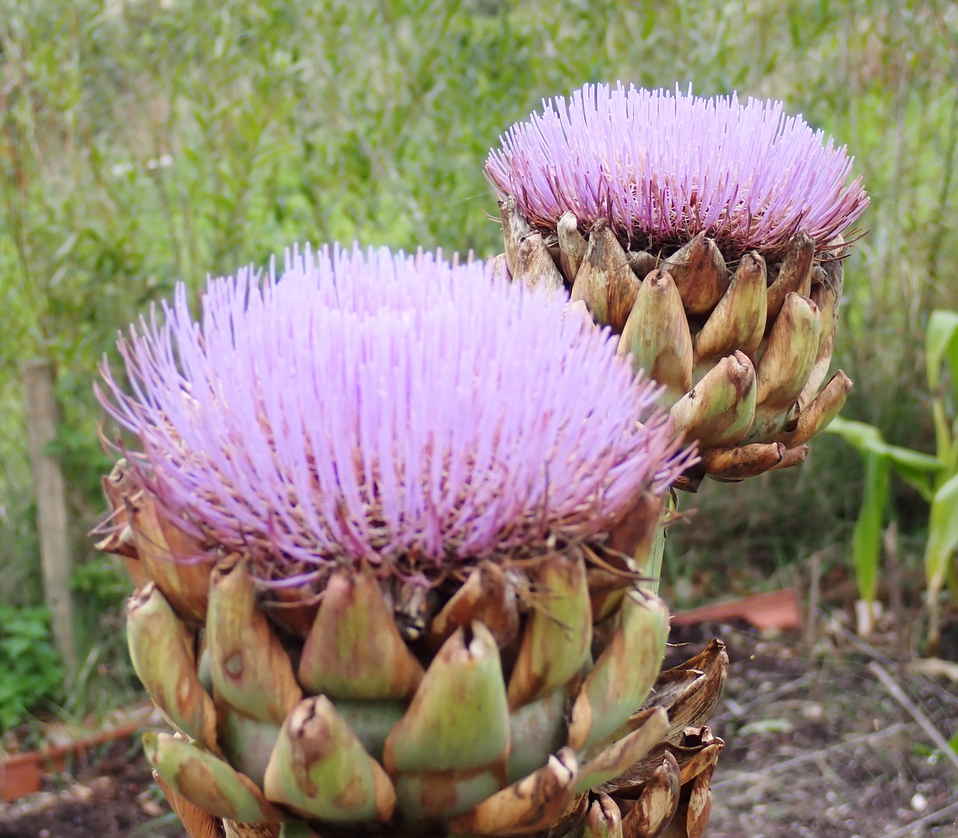 Sitting out at the top of the field on a damp morning – and there were many – several colours stood out in the mist. The beautiful lilac of the Artichoke flowerheads, we had so many this year we